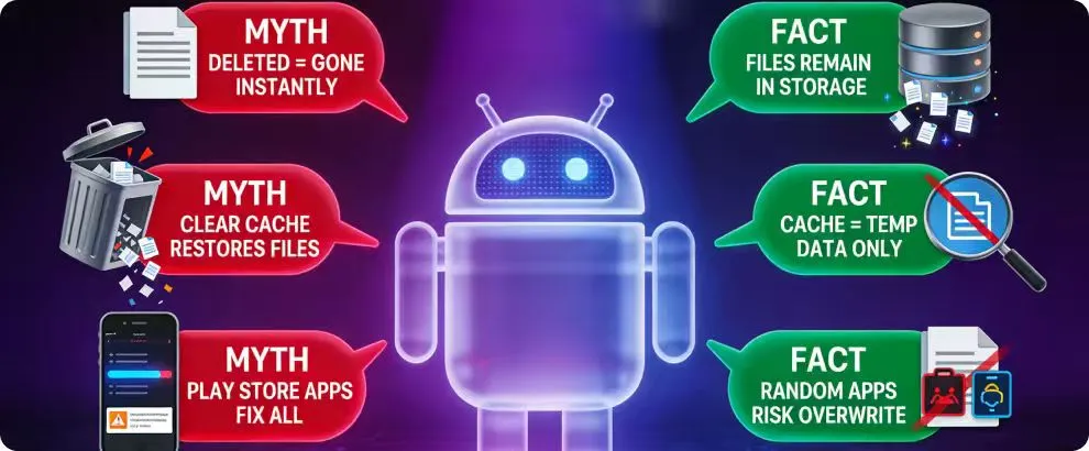 Another misconception is that installing a “super-fast recovery app” from the Play Store can fix everything. Most of these apps lack real scanning power. Some simply display ads, while others risk overwriting the very files users are trying to restore.