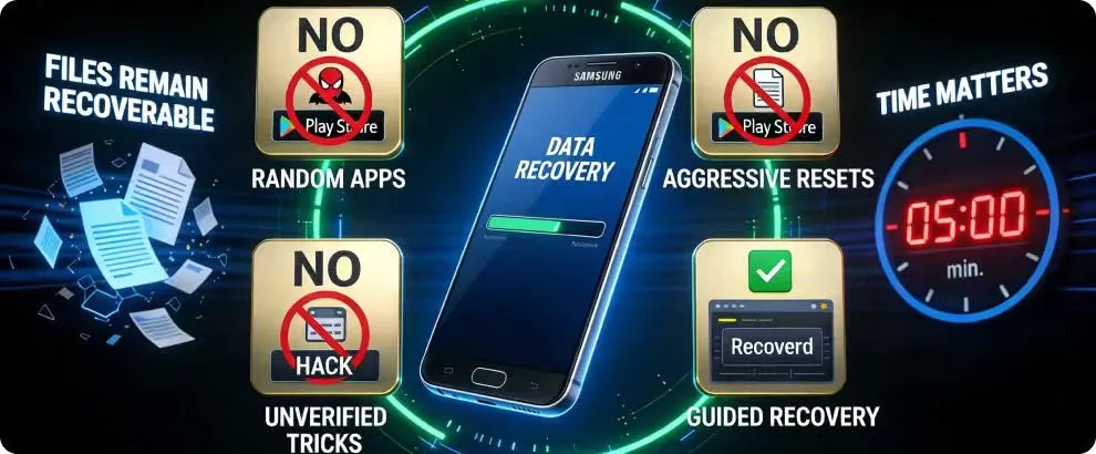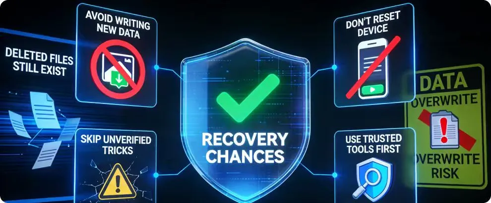 One of the most important things to understand is that deleted files still exist in storage for a short time. They only become unrecoverable when new data replaces them. That’s why it’s crucial to avoid installing random apps or copying new files immediately after data loss.