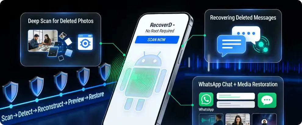 WhatsApp stores data in multiple hidden directories. RecoverD scans each layer to recover deleted messages, images, voice notes, and videos. Users get a preview before restoring, making it easy to recover only what matters.