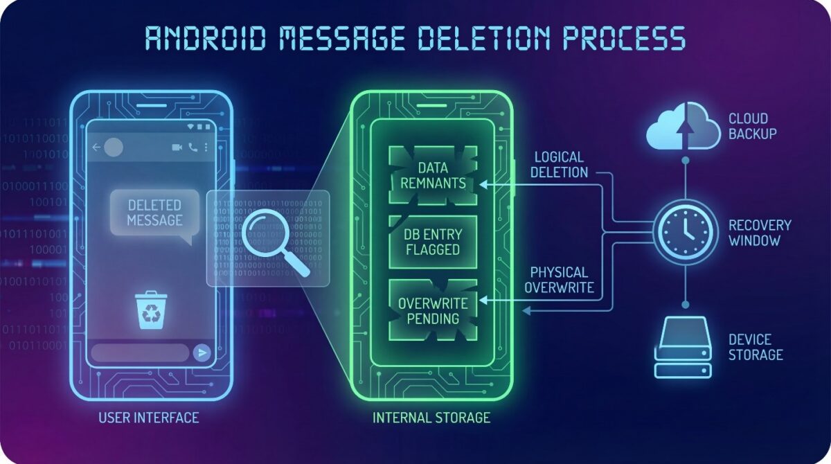When a message is deleted on Android, it is not immediately erased from the device’s storage system. Instead, the operating system marks that message space as available for reuse, while the actual data often remains temporarily intact.