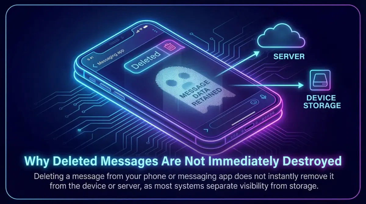Deleting a message from your phone or messaging app does not instantly remove it from the device or server, as most systems separate visibility from storage.